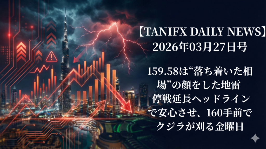 159.58は“落ち着いた相場”の顔をした地雷 ── 停戦延長ヘッドラインで安心させ、160手前でクジラが刈る金曜日 本日のマーケットサマリー(2026/03/27 朝時点) USD/JPY:159.580159.5台で滞空。ブレイク期待と介入警戒が同居し、最も流動性が厚くなりやすい... -