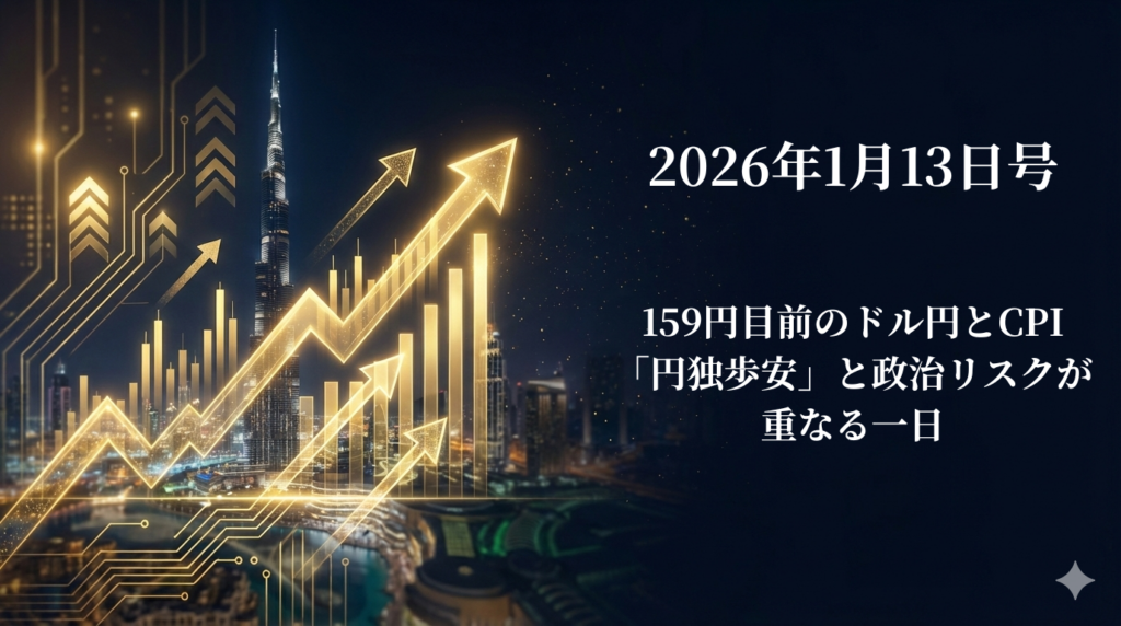 159円目前のドル円とCPI ── 「円独歩安」と政治リスクが重なる一日 ■ 本日のマーケットサマリー(2026/01/13 朝時点) 通貨ペア / 商品現在値コメントUSD/JPY158.69円159円大台を射程に円独歩安が継続EUR/JPY185.07円クロス円は総じて歴史的高値圏EUR/USD1...
